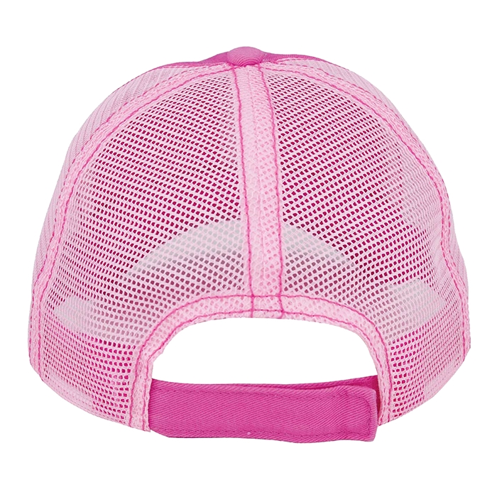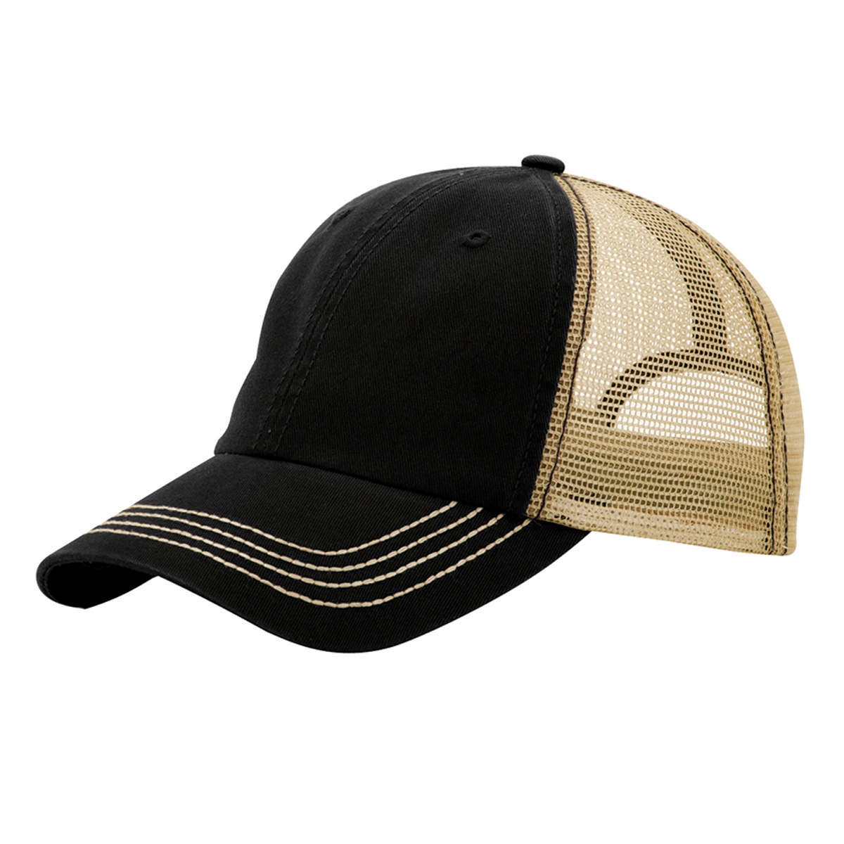 70% cotton, washed twill front, 30% polyester mesh back, unstructured, low-profile, six-panel, pre-curved contrasting stitch visor and undervisor. Velcro closure
